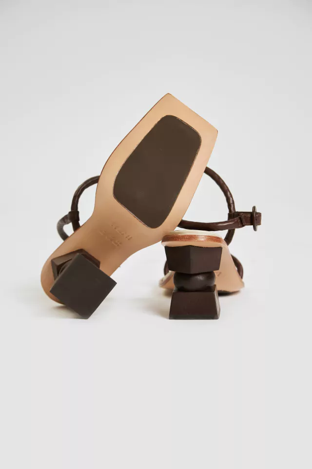 A Sandália Miwa foi desenvolvida para ser sofisticada e elegante. Uma sandália clean e leve com tiras minimalistas em couro sobre os pés, com a frente quadrada e forma exclusivamente desenhada pela Akemi que traz assimetria com o salto de madeira de reflorestamento pintada a mão e em formas geométricas com a base grossa que garante segurança ao pisar e com conforto.